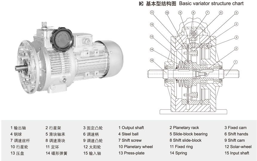 MB无级变速机基本结构图有15个方面介绍:1、输出轴 2、行星架 3、固定凸轮 4、钢球 5、滑块轴承 6、调速柄 7、调速丝杆 8、调速滑块 9、调速凸轮 10、行星轮 11、定环 12、太阳轮 13、压盘 14、碟形弹簧 15、输入轴